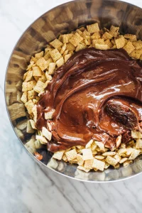 5. Pour the chocolate mixture over the Rice Chex cereal. Gently stir and fold until everything is coated evenly.